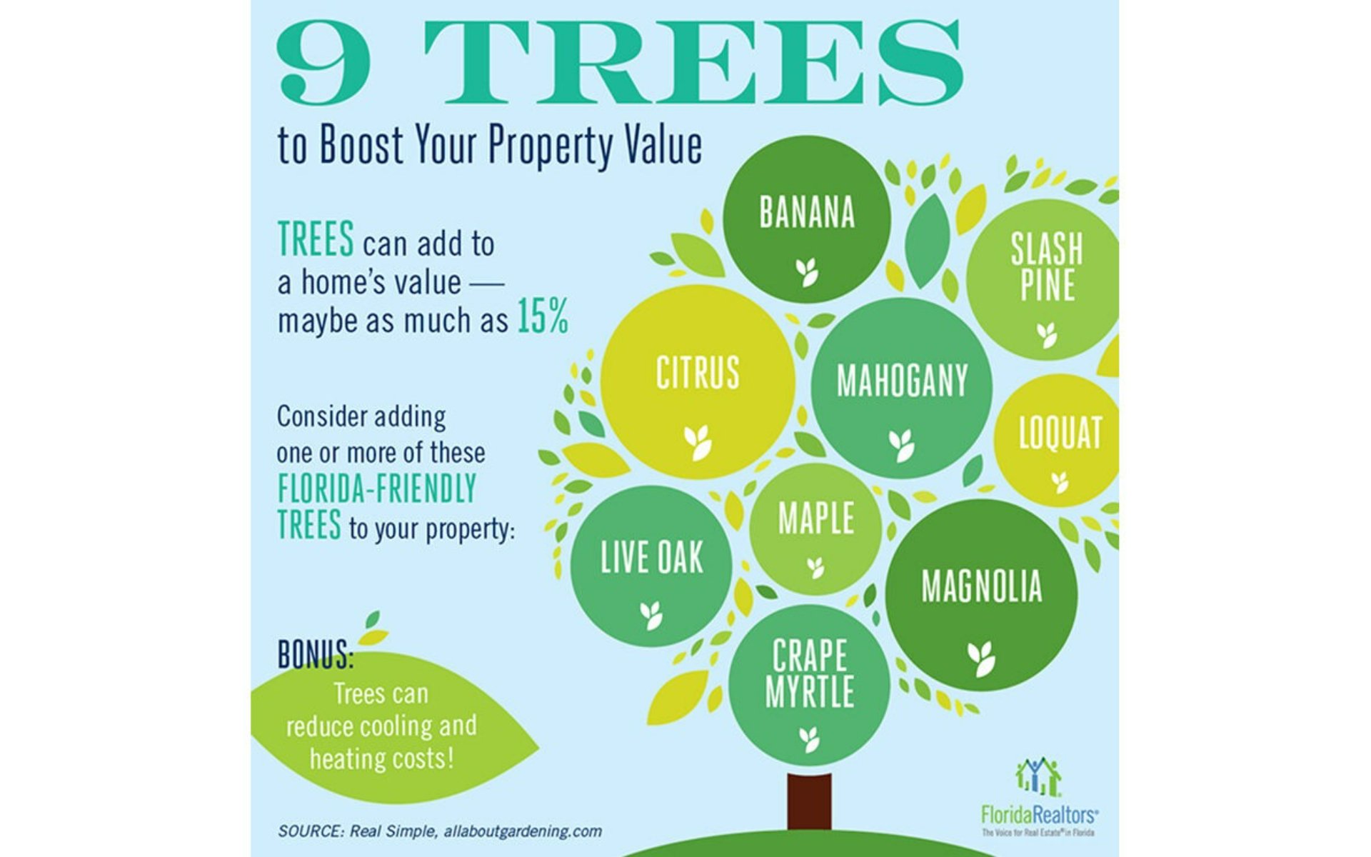 Although palm trees are typically the first that come to mind when thinking of Florida, there are more than 300 different tree species throughout the state. Trees can add as much as 15% to your home’s value, and can even reduce heating and cooling costs. Courtesy of Florida Realtors®, here are 9 Florida-friendly trees that can boost your property value!